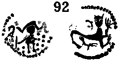 92. Л. с. Изображение человека в полный рост, вправо, с мечом в правой руке и щитом (?) в левой, позади непонятный предмет и три точки; вокруг точечный ободок.