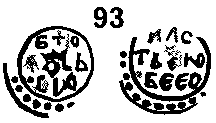 93. Вариант 1. Л. с. Трехстрочная надпись: Б+О||ЖЬ||ЕЮ; в середине второй строки помещено изображение головы человека в короне влево; вокруг точечный ободок между двумя линейными.