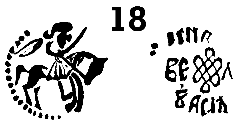 18. Вариант 2. Л. с. Изображение всадника с мечом в руке и развевающимся сзади плащом, едущего вправо; вокруг точечный ободок. (Возможно, тот же штемпель, что и в варианте 1, но с другим ободком.)