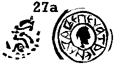 27а. Вариант 3. Л. с. Всадник, едущий вправо; под ногами лошади человеческая голова; вокруг точечный ободок.